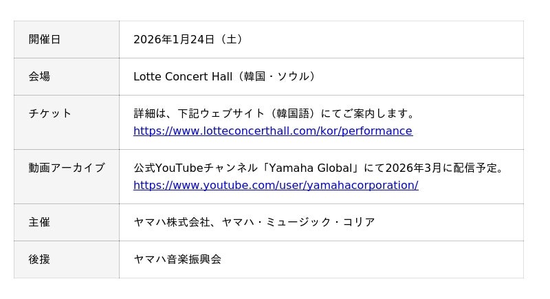ヤマハ株式会社(以下、当社)は、世界40以上の国と地域で展開しているYAMAHA MUSIC SCHOOL(ヤマハミュージックスクール、以下、YMS)の生徒が競演するイベント『The 7th Yamaha International Highlight Concert in Korea』(第7回ヤマハ・インターナショナル・ハイライト・コンサート・イン・コリア)を、2026年1月24日に、韓国・ソウルにて開催します。
