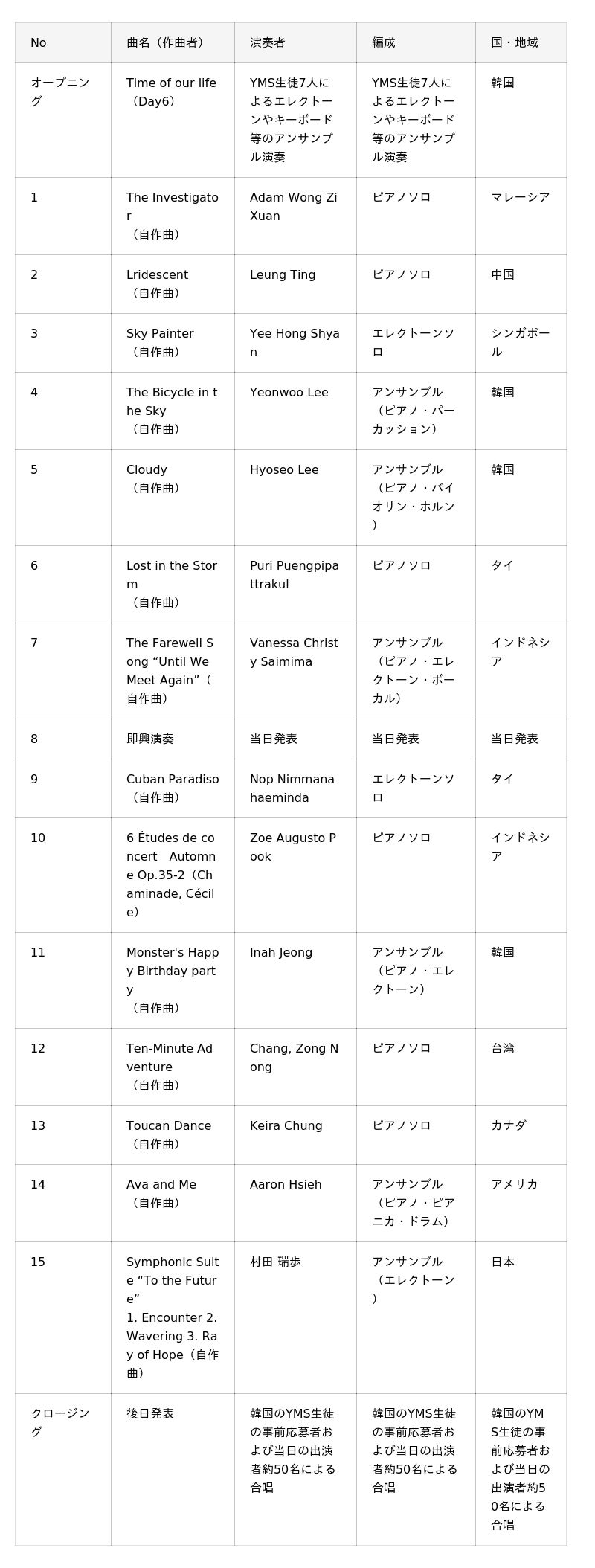 「ヤマハ・インターナショナル・ハイライト・コンサート」は、世界各地のYMSでピアノやエレクトーンなどを学ぶ生徒たちが一堂に会し、クラシック楽曲やジュニアオリジナルコンサート(注1)の生徒自作曲、即興演奏を披露します。今回は、10の国と地域から30名の生徒が参加し、創造的な音楽表現を披露します。また、韓国での開催にちなんで、YMS生徒が韓国を代表する実力派ロックバンド「Day6」の曲をオープニングで披露します。なお本イベントの模様は、2026年3月に当社YouTubeチャンネルにて配信予定です。
