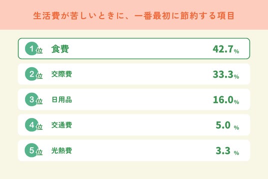 「生活費の中でまずどの項目を削りますか?」という質問に対し、全体の約4割が「食費」と回答しました。