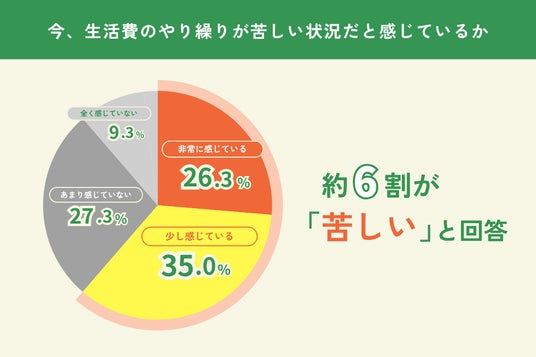 「最近、生活費が厳しいと感じることはありますか?」という質問に対し、「非常に感じている」が26.3%、「少し感じている」が35.0%となり、合計61.3%のZ世代が生活費のやりくりに苦しさを感じていることが明らかになりました。