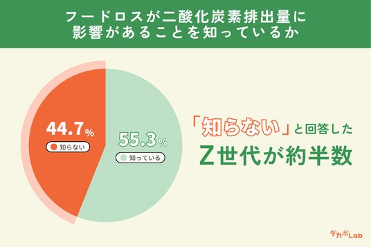 「フードロスが二酸化炭素排出量に影響を与えることを知っていますか?」という質問に対して、「知っている」と回答した人は55.3%、「知らない」は44.7%となりました。
