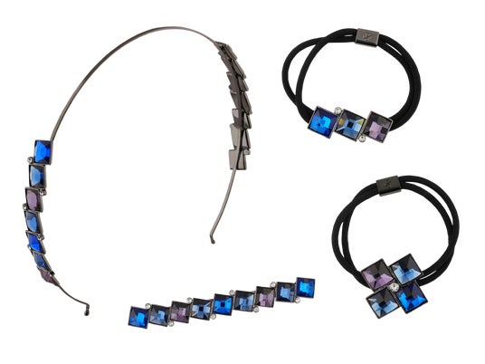 スクエアのクリスタルガラスをフィーチャーしたコレットマルーフの新作ポニー2種にヘッドバンドとバレッタのラインナップ。規則正しく並んだ3つのスクエアの間に2粒の小さなクリスタルガラスが輝き、リズミカルなフォルムはまるで髪につけるミニマルアートのよう。チェッカーボードカットのファセットがクールさを強調し、その名の通りプリズムのミステリアスな輝きが魅力。同じく4つのスクエアの中心に小さなクリスタルガラスが輝き、ウインドミル(風車)のモチーフに仕上げたポニーはブレスレットとしてもお使いいただけます。ヘッドバンドは細いワイヤーが髪に隠れることで美しい光のアラインが自然に立ち上がりアイキャッチーな仕様に。バレッタはシリーズの中でも9個のクリスタルガラスが並ぶことで、随一の華やかさを誇ります。どちらの配色もマチュアな雰囲気でドレスアップをより高貴に彩るアイテムです。