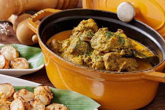 「ルンダン」はココナッツミルクとターメリックやコリアンダー・カルダモンなどの複数のスパイスで煮込んだインドネシアでは日常的に食べられる国民食とも云われる煮込み料理です。仕上げのタイミングで使うこぶみかんの葉(バイマックル)の深みのある爽やかな香り・ココナッツミルクの甘み・複雑なスパイスが重なり合うエキゾチックな味わいをお楽しみいただけます。