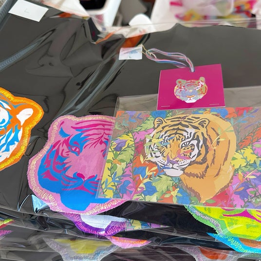 販売商品例(テキスタイルバッグ:押鐘まどか、名刺入れ:ミルクぱく子、イヤリング:梨絵)
