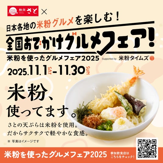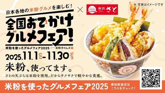 国内198店舗を展開する「和食さと」では、米・米粉消費拡大推進プロジェクトの一環として、2025年11月1日(土)~11月30日(日)の期間で開催する「日本各地の米粉グルメを楽しむ!全国おでかけグルメフェア!」のイベントに参加いたします。