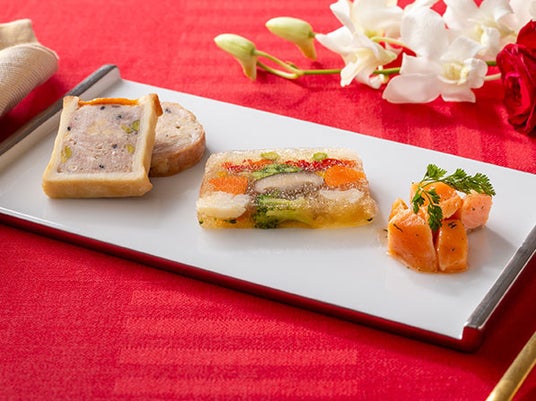 (画像左から)合鴨のパテのパイ包み・トリュフ入りチキンロースト・彩り野菜のゼリー寄せ・サーモンのディル風味