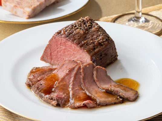 アメリカ産牛モモ肉にじっくりと火を入れました。スライスしてグレイビーソースをかけてお召し上がりください。