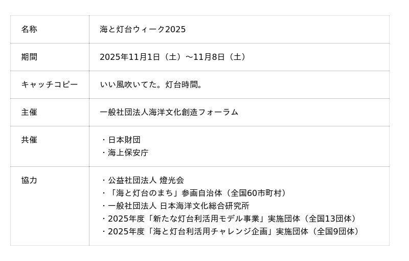 海と灯台ウィーク公式ウェブサイト:https://toudai.uminohi.jp/toudai-week2025/