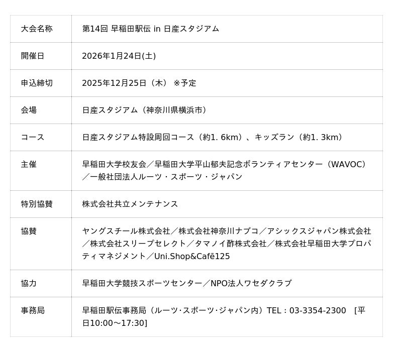-早稲田大学がプロデュースするチャリティーランニングイベント「走る」喜びを「支援」の力に!第14回早稲田駅伝in日産スタジアムへの継続協賛を決定-