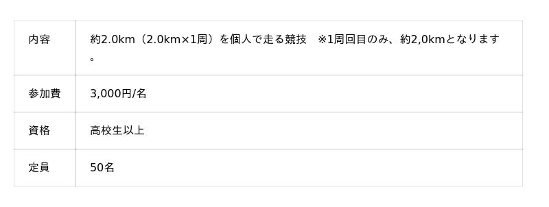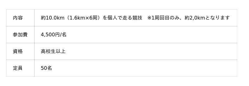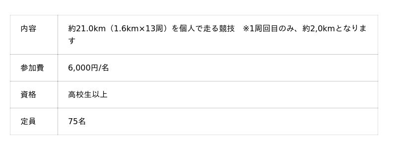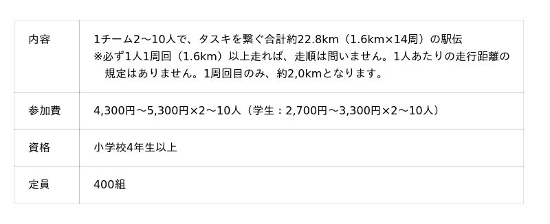2~10人のチームで走る「駅伝」、ハーフ(約21km)・約10km・約2kmから選べる「個人ラン」、小学生や未就学児の親子も参加できる「大隈ラン」の3種類があります。今回の「駅伝」は、1人1周以上走れば、チーム内の周回数や走順は自由。メンバーの走力に合わせて選択できますので、走るのがあまり得意でない方でもご参加いただけます。
