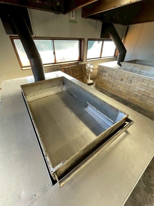 「誕生の塩」は海水浴場水質調査で最上位のAAランクに認定された美しい竹野の海水を汲み上げて平釜で丹念に炊く「釜焚き製法」。沸騰させないようにじっくりと炊くため、ミネラルを多く含んだキラッと光る粒の結晶が特徴です。使用する燃料の薪は竹野エリアに漂着した流木や廃材などを再利用しており、環境負荷の低減にも貢献しています。