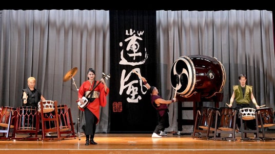 和奏ユニット蓮風による和太鼓と津軽三味線の演奏。会場内に響き渡る迫力ある演奏をお楽しみください。演奏前後には獅子舞が会場内やロビーを巡ります。太鼓の演奏体験では、たたき方やリズムのレクチャーを受けて実際に和太鼓を演奏できる時間をご用意します。