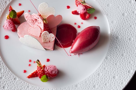 ● デザート「ハートのヴァシュラン 苺と赤い果実のムース マリー・アントワネット ティー香るソースを合わせて」は苺とフランボワーズ、ブラックベリーなど様々なベリーを使った芸術的な一皿です。