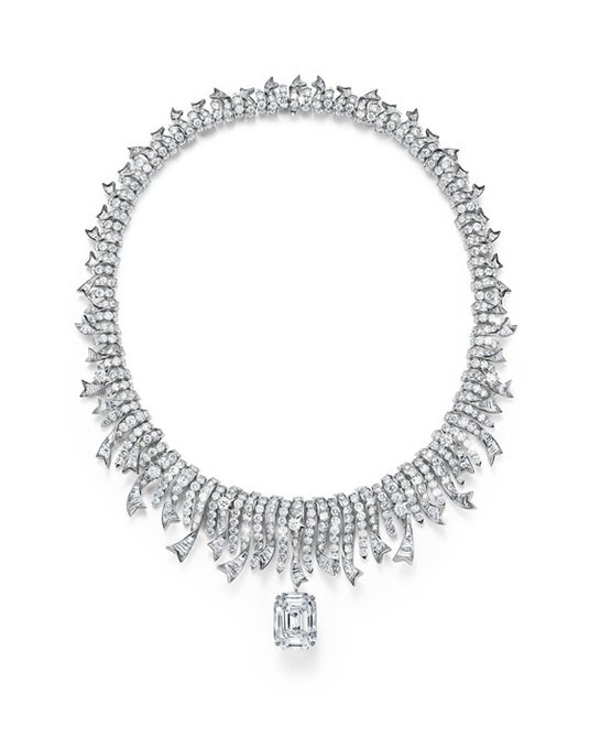 ナタリー・ヴェルデイユとティファニーの デザイン スタジオが手掛けた「ブルー ブック2024:ティファニー セレステ」で発表されたシューティング スター ネックレスは、ティファニーを象徴するモチーフのひとつであるリボンが流れ星の輝きを想起させる印象的なデザインが特徴です。息をのむようなDカラー、約19カラットのエメラルド カット ダイヤモンドが際立つこの壮麗なネックレスは、ティファニーが誇る卓越したダイヤモンドの権威を示しています。さらに、中央のダイヤモンドは、ネックレスから外してリングとして着用することができる細工が施され、ティファニーが追求する独創的な芸術性と比類なき職人技を体現しています。