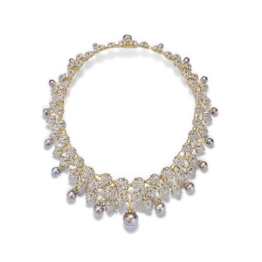 プラチナと18Kイエローゴールド製のカスケード ネックレスは、ジャン・シュランバージェの象徴的な「リーフ ネックレス」に着想を得て、ジュエリー & ハイジュエリー部門チーフ アーティスティック オフィサーを務めるナタリー・ヴェルデイユとティファニーのデザインスタジオが手掛けました。合計約75カラットに及ぶ天然海水パールと、合計51カラットを超える1,276石のラウンドブリリアント カット ダイヤモンドを配し、流れるようなゴールドの蔓と光沢感のあるパールが自然の美を讃えるデザインです。天然海水真珠の世界的権威であるフセイン・アル・ファルダン コレクションより厳選されたこの天然海水パールは、その希少性と光沢のみならず、卓越したサイズ、カラー、グラデーションが完璧な調和を奏で、まさに驚異的な偉業と言えるでしょう。