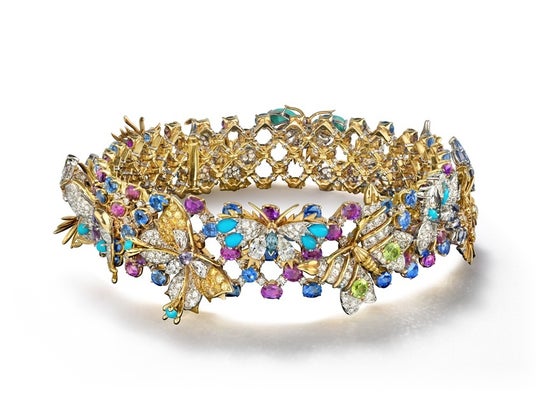 またジャン・シュランバージェがティファニーのために手掛けた初期のハイジュエリーデザインの一つである「バタフライ チョーカー」は、ヘリテージ賞を受賞しました。1956年にデザインされたこの作品は、友人でアメリカの慈善家兼園芸家であるレイチェル・ランバート“バニー”メロンから着想を得て製作された、蝶の美しさを捉えたネックレスです。これは、彼女が五番街のティファニー本店に当時新設されたシュランバージェ サロンを訪れた際に生まれたアイデアで、同年、ティファニーの職人たちがニューヨークのハイジュエリー工房で具現化しました。ダイヤモンド、ターコイズ、アメジスト、ペリドット、サファイヤ、スピネルを精緻に配し、蝶が羽ばたく躍動感を想起させます。バージニア美術館より貸与されたこの作品は、ジャン・シュランバージェのハイジュエリー作品、そしてメロンとの深い交流を象徴する傑作として今なお高く評価されています。