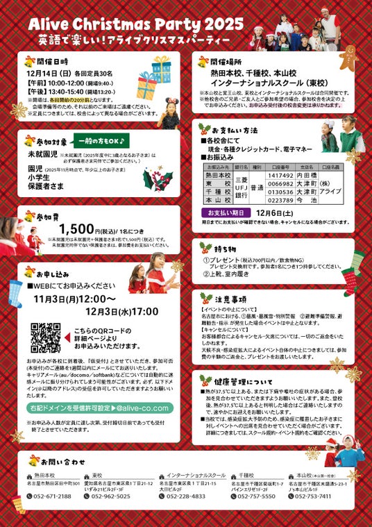 株式会社アライブ(本社:愛知県名古屋市、代表取締役:三井博美)は、2025年12月14日(日)に、未就園児、園児、小学生および保護者の方を対象とした英語のイベント『アライブ主催クリスマスパーティー2025』を開催いたします。アライブの在籍生に限定されず、どなたでも参加が可能です。