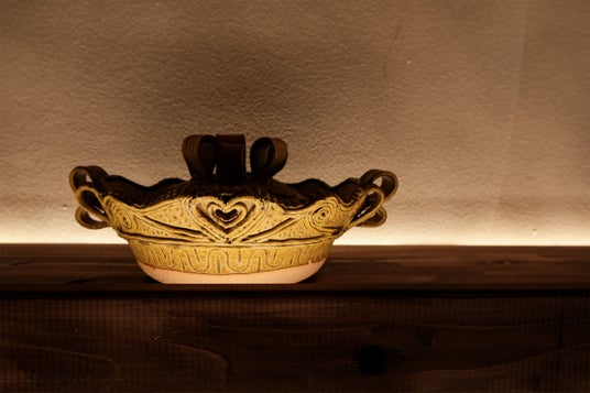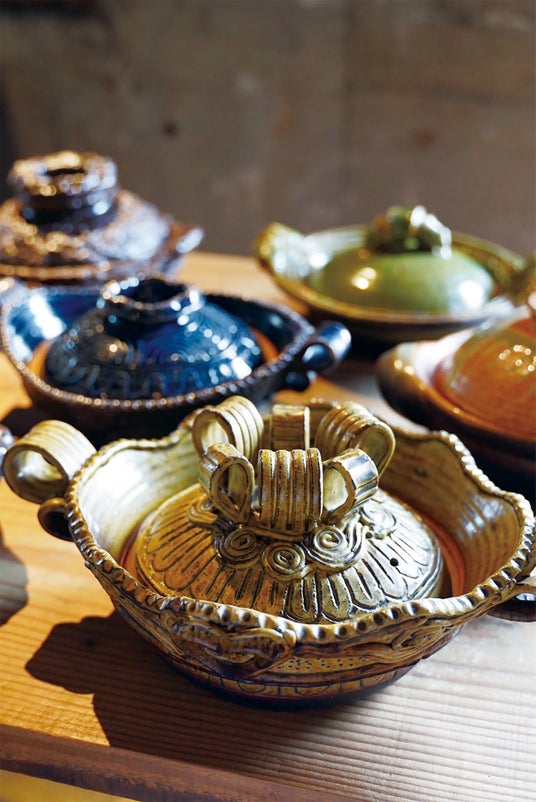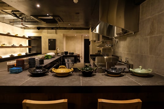 カウンター席の後ろにはギャラリーが設けられており、こちらに並ぶオリジナルの土鍋や陶器などは、店頭でご購入いただくことも可能です。