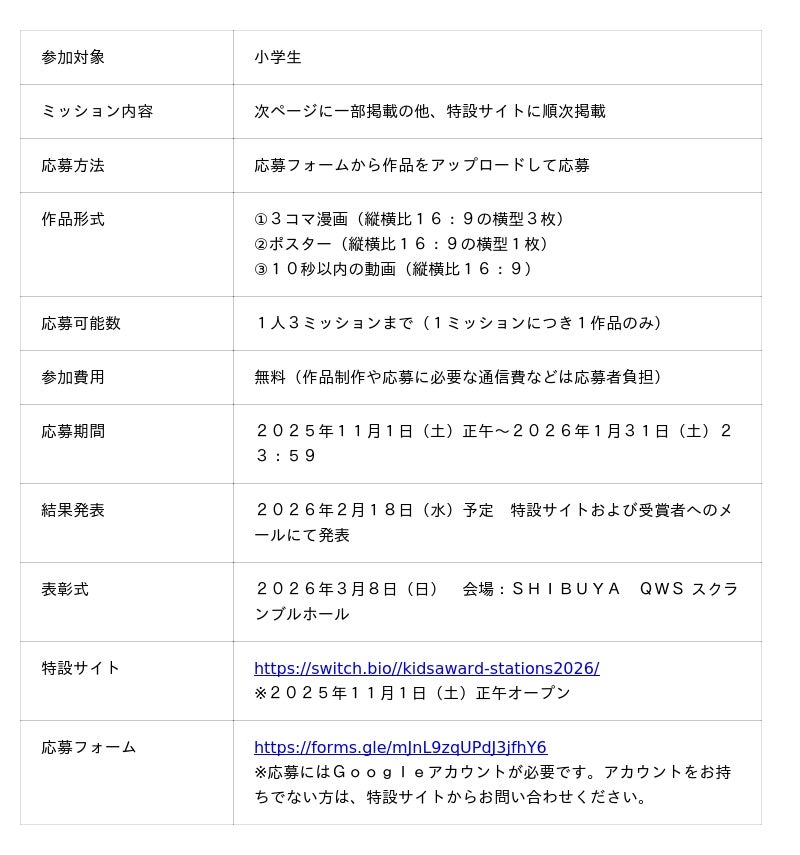 一般社団法人SWiTCH(以下、SWiTCH)と東急株式会社(以下、東急)は、相鉄ホールディングス株式会社の特別協賛のもと、小学生を対象にSDGsに関連したポスターなどの作品を募集し、優秀な作品を表彰および公開するイベント「サステナ KIDS AWARD SDGs STATIONS東急・相鉄沿線」(以下、本アワード)を共同で開催します。募集作品のテーマとなる東急などの企業・団体が設定する「ミッション」の内容や賞品などを掲載する特設サイトを2025年11月1日(土)正午にオープンし、作品の募集を開始します。