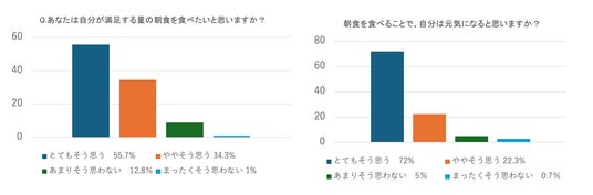 一方で中高生(13歳~18歳)を対象に朝食に関するアンケート調査を実施したところ、朝食を食べる頻度についての質問に、「週7日」74%、「週6日」 12%と、8割以上がほぼ毎日朝食を食べていることがわかりました。また、朝食のボリュームについて「満足する量を食べたいか?」という質問に約9割が「とてもそう思う・ややそう思う」と回答し、「朝食を食べることで、自分は元気になると思うか?」という質問に対し、7割以上が「とてもそう思う」と回答していることから、多くの中高生が毎日朝食を食べており、朝から満足する量を食べ、1日を元気に過ごしたいと考えていることが調査でわかりました。