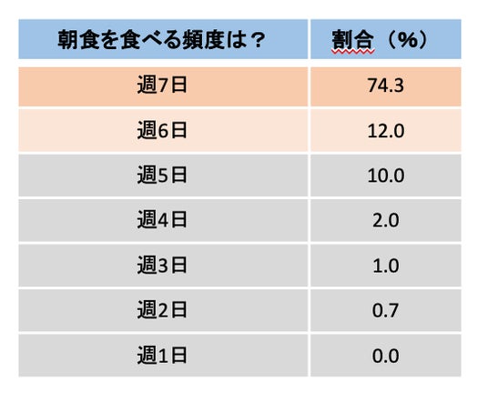 ・朝食を食べる頻度は、「週7日」74%、「週6日」 12%と計86%の人がほぼ毎日朝食を食べていることが判明。 ・約9割が「朝食に満足する量を食べたい」と回答。 ・7割以上が朝食を食べることで「自分は元気になると思う」と回答。 ・