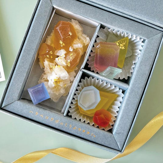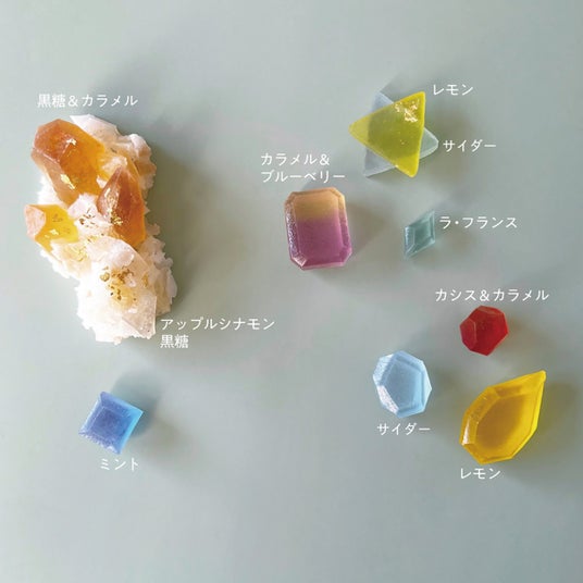 砂糖と寒天からできた和菓子の一種、琥珀糖。「こうぶつヲカシ」はこれに鉱物や宝石のイメージを加えた、アート作品のようなお菓子です。石の美しい佇まいを想像しながら、ひとつひとつ職人の手で切り出しており、どれひとつとして同じものはない唯一無二の作品が出来上がります。また、天然由来の色素を使った繊細な色のグラデーションの表現や、リキュールや果汁を使った多彩な味のバリエーションもこうぶつヲカシならではの魅力のひとつです。こうぶつヲカシという名前は、大好物と鉱物をかけ、いとをかしなお菓子として名づけました。