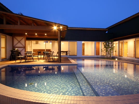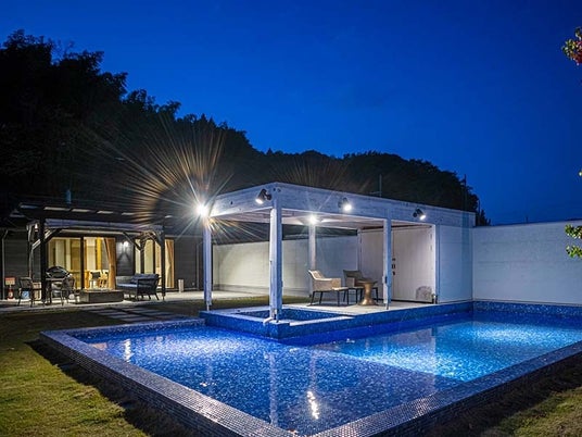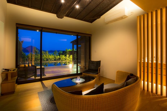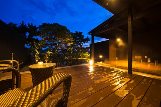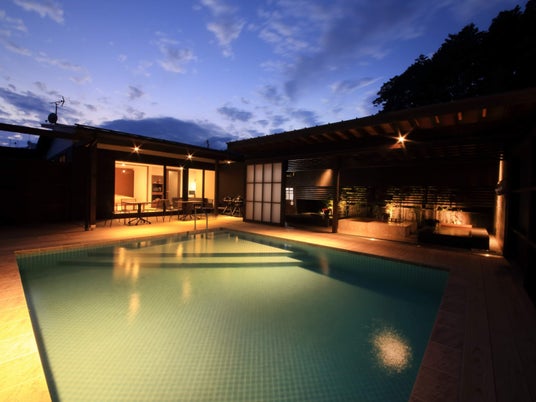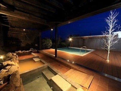 全室に鉄分豊富で全国的にも希少な赤湯の天然温泉露天風呂とプライベートプールを完備した一棟貸切型ヴィラ。愛犬同伴客室もあり、プライベートダイニングでカニマルシェの活ガニを楽しめます。