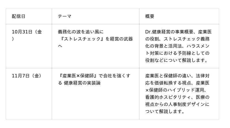 Dr.健康経営の代表で産業医でもある田中 茂揮氏に2週にわたり、現在多くの企業で関心が高まっている「ストレスチェックの活用法」や、次世代の健康経営のあり方である「産業医と保健師によるハイブリッド運用」について、医療と経営の両方の視点から解説していただきました。