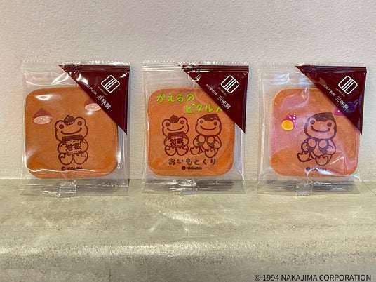 MATSUZAKI SHOTEN(銀座 松崎煎餅 本店)では、人気キャラクター「かえるのピクルス」デザインの三味胴や限定スイーツセットなどを販売いたします。秋のおでかけに是非お立ち寄りください。