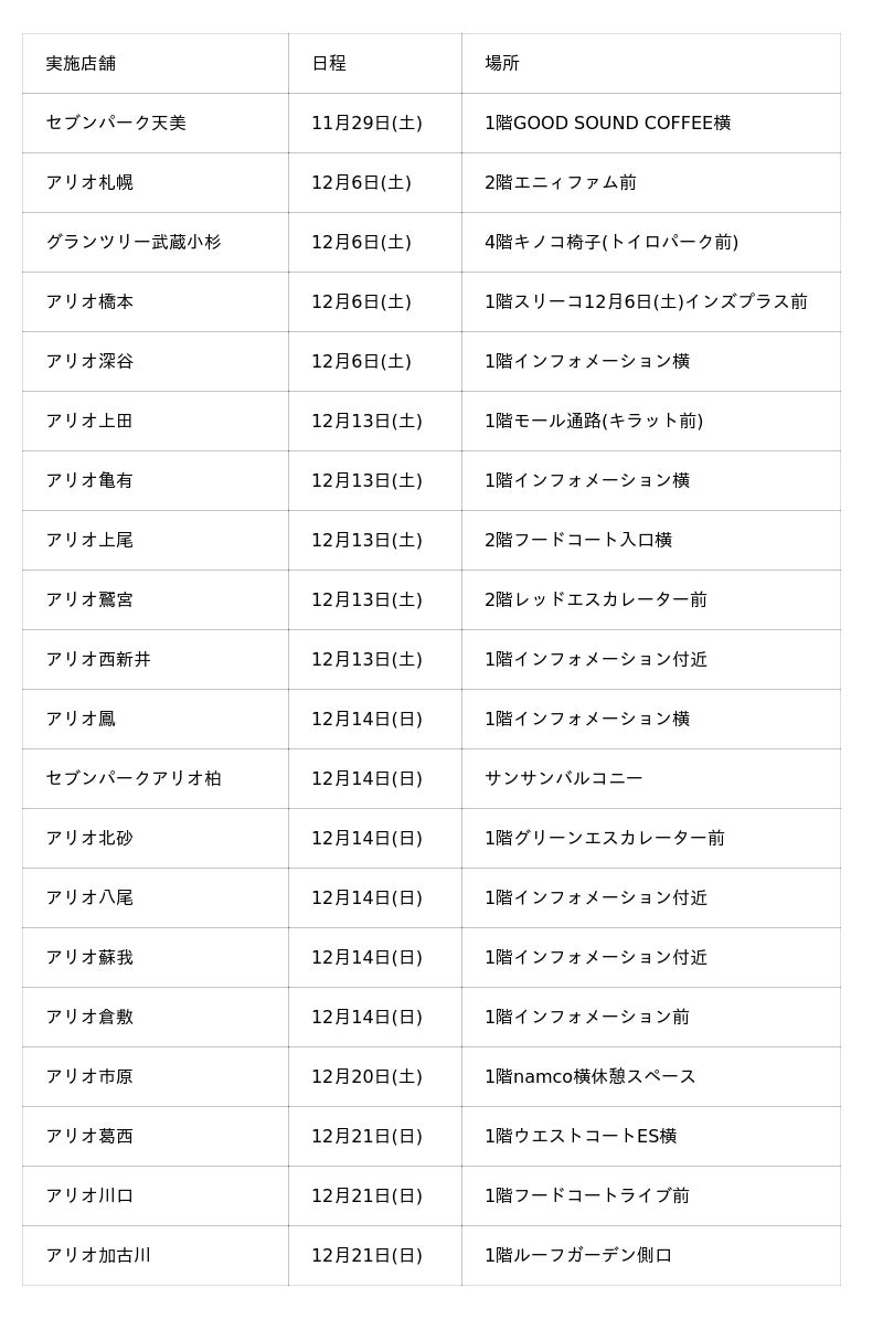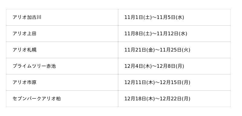 【実施店舗】 :アリオ各店・グランツリー武蔵小杉・プライムツリー赤池・セブンパーク天美