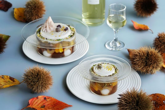 源氏物語ミュージアムのエントランスガーデンや平安時代の洲浜をイメージしたボウルパフェ。ボウルの中に自家製のほうじ茶ジェラート・ほうじ茶シフォンと季節の栗などを宝石のように詰め込みました。ほうじ茶ゼリーには店舗で扱っている本格焙茶「中の君」を使用しています。さらにオレンジの果肉と果皮も使用したオレンジソースのさわやかな酸味が栗の風味を引き立たせ、他にはない深い味わいをお楽しみいただけます。季節の移ろいを感じながら、特別なひとときを過ごすのにぴったりな一品です。