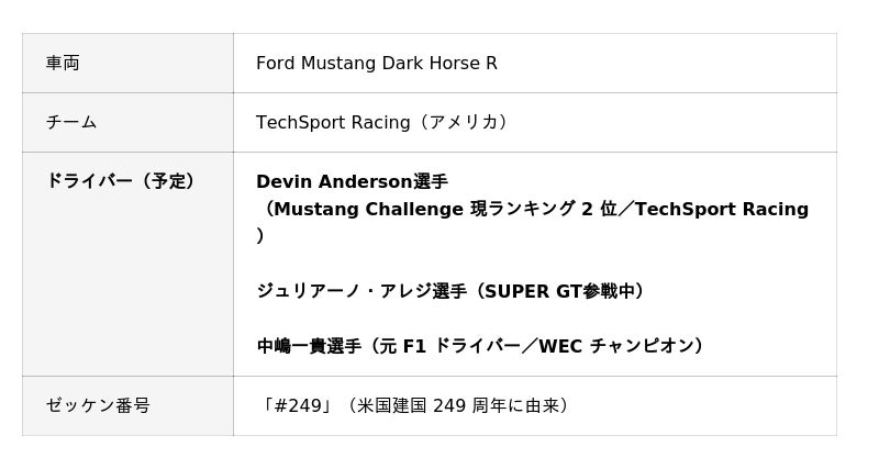 今回は2台のアメリカンGTマシンが富士スピードウェイで走行を予定。轟音を響かせるパワフルなエンジンと独特のスタイルが、S耐シリーズのフィナーレを彩ります。