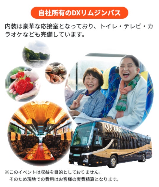 また、いーふらんでは現在5台のリムジンバスを所有しており、バスツアーをはじめとする様々なイベントで大活躍しています。運行は、社内の車両管理部に所属するプロのドライバーが担当するため、安心・安全にツアーを楽しむことができます。
