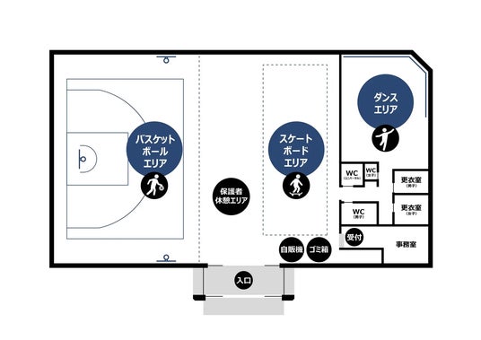 ロックユニット「COMPLEX」から頂いた寄附金を活用して整備された「子ども向けアーバンスポーツ施設」です。施設内には3×3(スリー・エックス・スリー)バスケットボール、スケートボード、ダンスが楽しめるエリアを備えています。子どもたちがのびのびと遊べる場として利用できるよう、利用料金は無料です。プロを招いたスクールの開催や、イベント会場としての利用も想定しています。