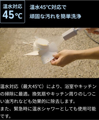 ・温水対応最大45℃対応で浴室・キッチン周りの油汚れにも効果を発揮。換気扇やキッチン周りのしつこい油汚れなども効果的に除去。さらに、緊急時の温水シャワーとしても使用可能