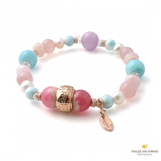 インカローズやクンツァイト、モルガナイトやディープローズクォーツなど、愛の石を贅沢に使用した女性らしいブレスレット。