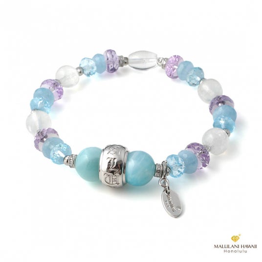 ムーンストーンやアメジスト、ブルートパーズやアクアマリンなど、涼しげな透明感が際立つ石達は、心身の安定をもたらし、穏やかな波動で持つ人を守るブレスレット。