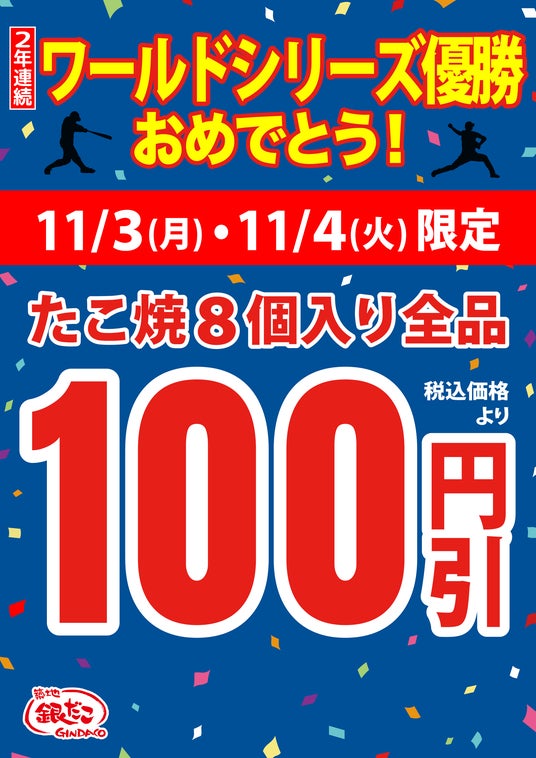 ロサンゼルス・ドジャースが2年連続でワールドシリーズ(WS)を制覇!築地銀だこでは、この歴史的快挙を祝し、“銀だこ史上初” となるたこ焼(8個入り)全品を対象とした “優勝おめでとう!セール” を開催いたします!期間中、定番商品をはじめ期間限定商品を含む、たこ焼(8個入り)全品を税込価格より 100円引き にてご提供。アツアツのたこ焼を食べながら、ドジャースの偉業を一緒にお祝いしましょう!