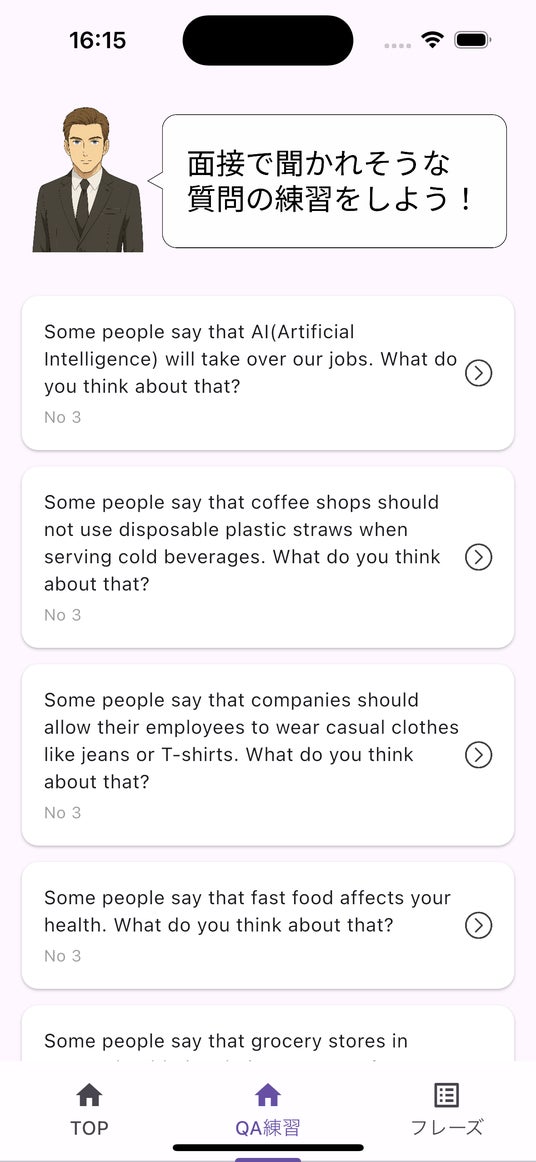 アプリ内の面接官キャラクターを相手に、本番の緊張感の中で繰り返し練習することで、自信を持って試験に臨むことができます。本番と同じ面接の流れで練習できます。