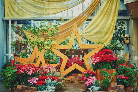 温かみのある木製の星のモニュメントや植物でキラキラとした空間を演出。ポインセチアを中心に、プリンセチアやシクラメン、ガーデンシクラメン、ゼラニウム、エレモフィア、モミなどクリスマスカラーの植物で装飾された室内で楽しめる人気のフォトスポットです。天井からは、トラディスカンティアのハンギングが降り注ぎ、大きな星のモニュメントとともに温かくお迎えします