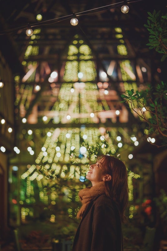 温室内にたたずむ「愛の像」がイルミネーションで彩られ、撮影スポットが登場します