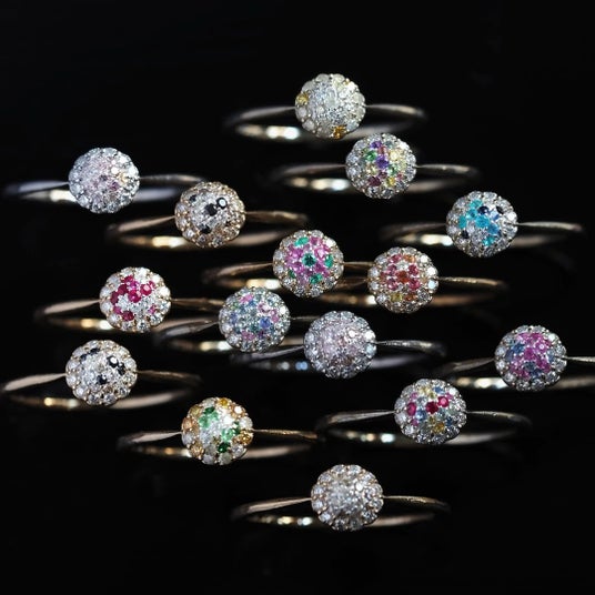 PARCELLE JEWELRYのパヴェは、単なる石留めではなく、地金の余白までも計算された職人技の結晶。指先ほどの小さな世界に、17石のダイヤモンドとカラーストーンを一石ずつ丁寧に留め、光の粒が重なり合うことで生まれる奥行きと色彩のハーモニーを描き出しています。