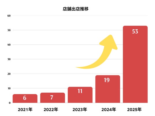 2021年時点で6店舗だったところから、2025年12月末時点では53店舗へと成長し、約9倍の拡大を達成する見込みです。