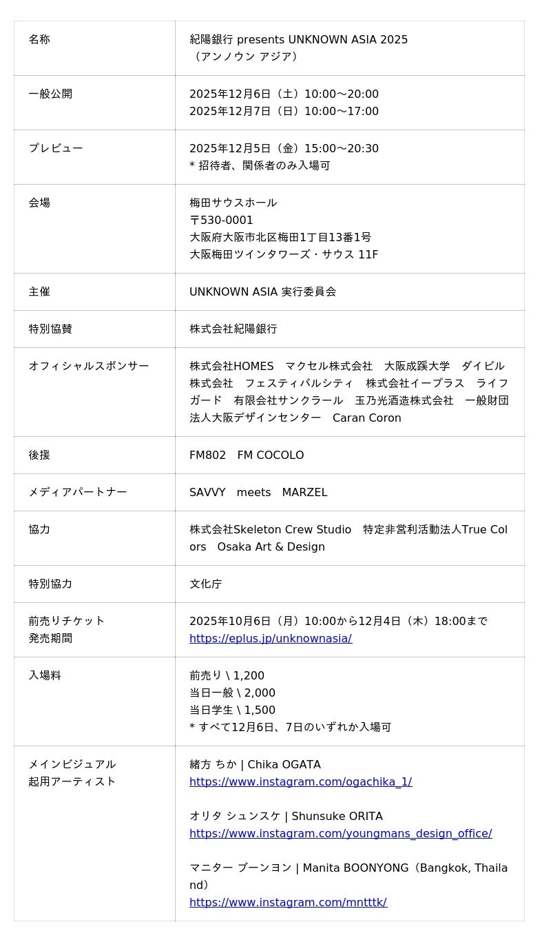 UNKNOWN ASIA 実行委員会(大阪市北区)は、2025年12月5日(金)から12月7日(日)の3日間、梅田サウスホールにて開催(*)する国際的なアートフェア「紀陽銀行 presents UNKNOWN ASIA 2025」について、厳正なる審査を通過した国内外の出展アーティストを決定いたしました。