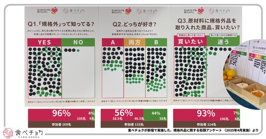 2025年4月にJR新宿駅改札前のマルシェにて、食べチョクが道ゆく一般の方々に行った「正規品」と「規格外品」を食べ比べた街頭アンケートで、買いたいが9割にも上ることが判明。本プロジェクトが、食品ロス削減という社会課題解決への強い後押しに繋がると期待できる根拠となっています。