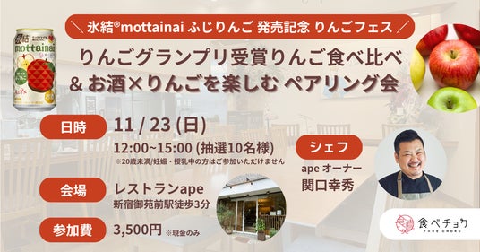 氷結(R)mottainai ふじりんご発売を記念し、お酒とりんごを楽しめるイベントを開催いたします。規格外品と正規品のりんご青果の食べ比べや、お酒にあう「りんごを使った一皿」を提供し「モッタイナイ果実」の価値向上を目指します。また、2025年11月19日(水)に食べチョク主催で開催する「りんごグランプリ2025」で選ばれし受賞りんごの食べ比べ体験も実施します。