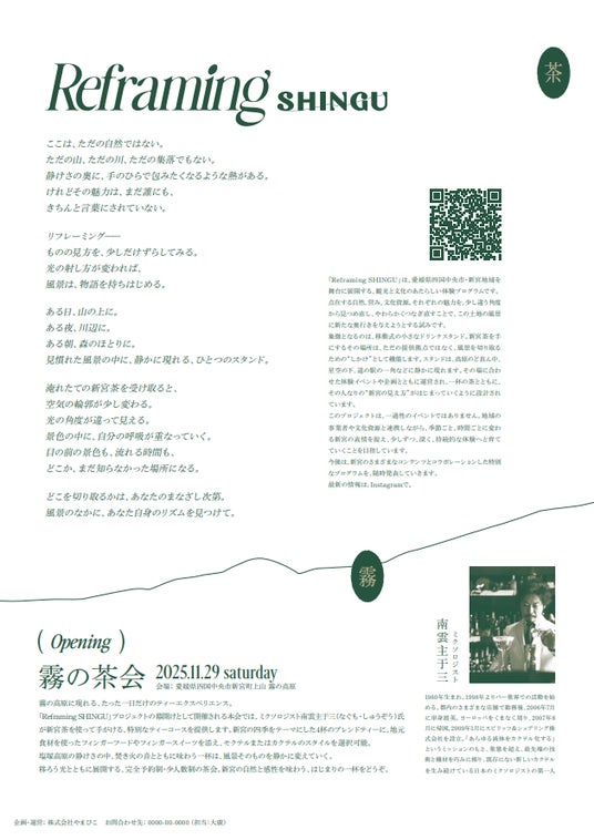 イベント開催に先立ち、報道関係者の皆様を対象とした移動式スタンドのお披露目および「霧の茶会」の先行体験・取材機会となるメディアデーを設けます。「Reframing SHINGU」プロジェクトの目的と今後の展望をご説明。完成した移動式スタンドのお披露目と、コンセプトに合わせた展示、第1弾イベント「霧の茶会」で提供される特別な新宮茶メニューの一部をご試飲。開 催 日 時: 2025年11月26日(水)13:00~15:00