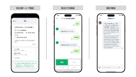 この度、本サービスでは「他店舗ヘルプ」「勤怠打刻」「翻訳」機能の提供を開始し、店舗管理者の負荷軽減とコミュニケーション課題を解決し、誰もが働く幸せと喜びを感じられる社会の実現に繋げてまいります。