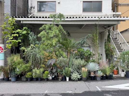 大阪・谷町六丁目にある観葉植物店。植物の販売をはじめ、屋内外の植栽コーディネイトや造園施工を行なっている。店頭には、観葉植物から庭木まで、暮らしのスタイルや空間に合わせてご提案できるよう、さまざまな植物が揃う。