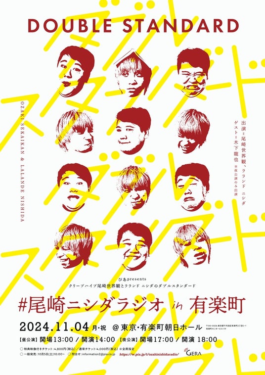 ラジオアプリ「GERA」内で配信中の番組『ぴあpresents クリープハイプ尾崎世界観とラランド ニシダのダブルスタンダード』が3回目(PIA MUSIC COMPLEXの公開収録を含めると5回目)の有観客イベント「#尾崎ニシダラジオ in 武蔵野公会堂」を来年1月20日(火)に東京・武蔵野公会堂にて開催することが決定いたしました。